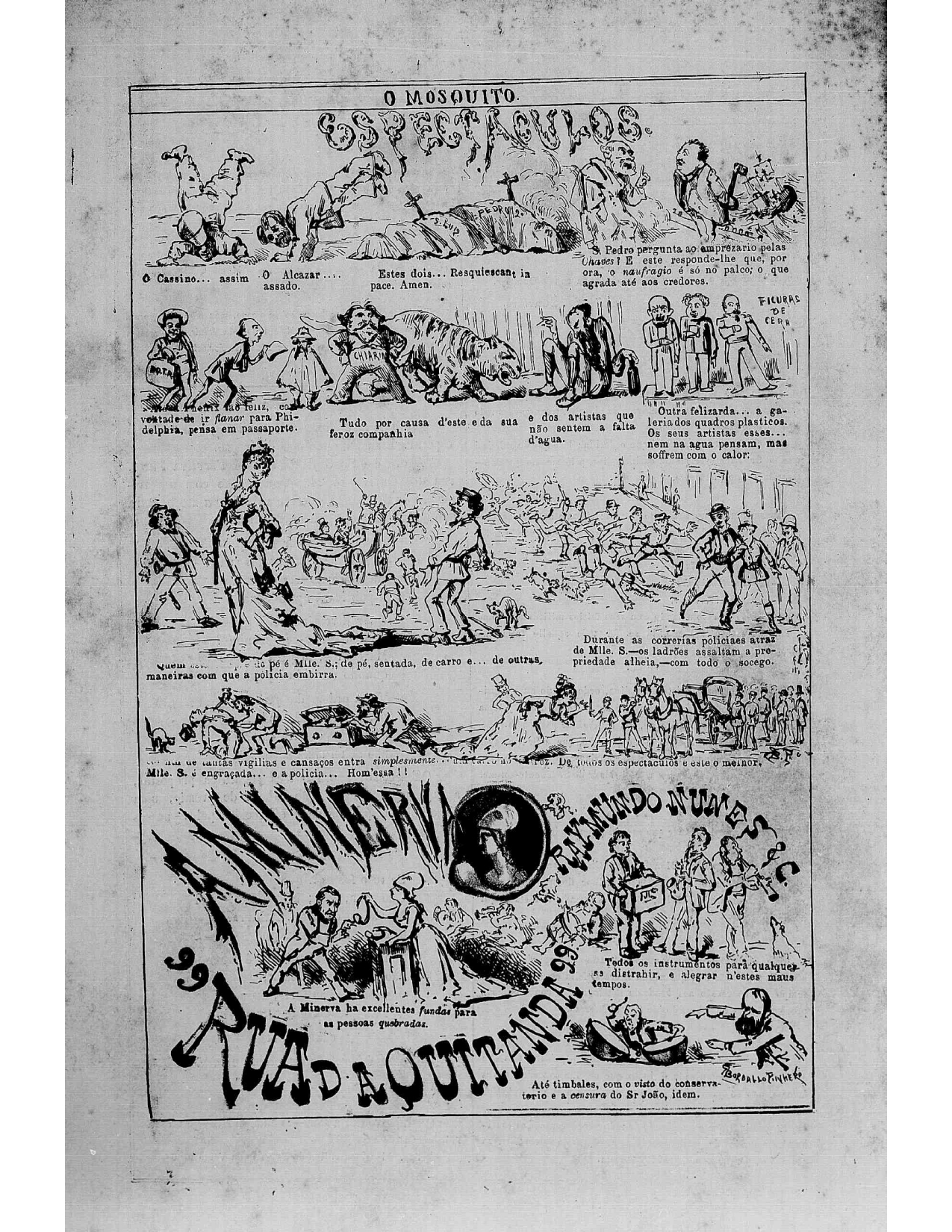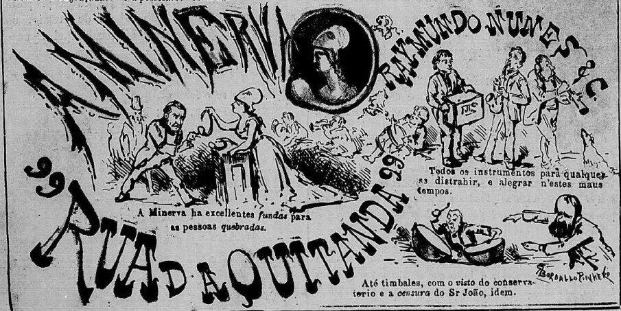 - Propaganda de uma loja chamada “A Minerva”, publicada no periódico “O Mosquito”, em 19 de janeiro de 1876, integrada a uma caricatura de uma página inteira denominada “Os Espetáculos”. Este estabelecimento era uma loja de variedades típica do século XIX. Segundo uma propaganda de 1874 publicada no “Almanak Administrativo, Mercantil e Industrial do Rio de Janeiro”, o sortimento desta loja incluía instrumentos de música, de ótica, para cirurgia e acessórios da arte dentária, além de materiais para o estudo e prática de ciências físicas e ornamentos para altar e Igreja. Em ambos os anúncios, o endereço da loja permanece o mesmo, Rua da Quitanda 99, localizado no centro da cidade do Rio de Janeiro, em uma região com grande concentração de estabelecimentos comerciais, incluindo, ainda, o nome do proprietário da firma – Raimundo Nunes – que também permanece o mesmo nos dois anúncios. A caricatura contém duas partes. Na parte superior, Bordalo ironiza a situação de alguns dos mais importantes teatros da cidade do Rio de Janeiro (Cassino, Alcazar, São Luiz e São Pedro de Alcântara), a figura de um dos seus principais empresários (o português Furtado Coelho 1831-1900) e, especialmente, a ineficiência da polícia que estaria se empenhando mais em tentar reprimir espetáculos teatrais do que resolver outras demandas da cidade. Na parte inferior, localiza-se a propaganda que dentro da caricatura realiza uma dupla função: fazer a promoção da loja e, ao mesmo tempo, ironizar algumas questões econômicas e políticas-culturais e artísticas que estavam ocorrendo naquele momento. A partir de uma legenda inserida no meio do anúncio afirma-se que na loja “Minerva há excelentes fundas para as pessoas quebradas”, sabendo que as “fundas” eram um tipo de suporte para conter hérnia e que as “pessoas quebradas” representavam aquelas mais afetadas por uma crise econômica na qual o Brasil Império passava naquele período. O teor político, musical, artístico é concluído na frase seguinte, onde afirma-se que a loja tinha “todos os instrumentos para qualquer um se distrair e alegrar, nesses maus tempos [de crise]”, incluindo “até timbales, com o visto do conservatório e a censura do Sr. João”, isto é, o Conservatório Dramático Brasileiro, que funcionava como um órgão oficial de censura teatral, e o seu então presidente, João Cardoso de Menezes e Souza, apelidado por Bordalo como “Sr. João Censura”, quem autorizaria que os tais timbales fossem tocados – valendo destacar que esse trecho da legenda está acompanhado pelo desenho de alguns instrumentistas tocando os tais timbales e também clarinete, saxofone, realejo, trompete e pratos.